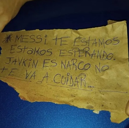 “Messi, te estamos esperando. Javkin también es narco, no te va a cuidar”, fue el mensaje escrito en un cartón que dejaron en el supermercado de la cadena Único, que pertenece a un familiar de la mujer del capitán de la Selección Argentina campeona del mundo en Qatar 2022.