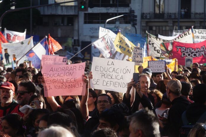 –La universidad pública, el sistema científico-tecnológico y toda la educación en general se encuentran en la peor situación desde el retorno de la democracia. Esto no significa que no haya habido ajustes o transferencias previamente. Pero la situación de desfinanciamiento de la educación pública no había nunca conocido estos extremos. Hoy el gasto en universidad araña el 0,40% del PBI. En países vecinos como Chile y Brasil, supera el 1,30% y en Alemania, el 1,5%. También existe, y hay que decirlo, el autoajuste de las autoridades universitarias. En estos días se ha producido la reforma del sistema curricular de las carreras de Economía y Administración en la Facultad de Ciencias Económicas de la UBA. Han cerrado la cátedra de Economía y Derechos Humanos, mostrando una adaptación al proyecto de Milei.