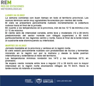 HomeClimaComienza la semana con temperaturas elevadas y fuertes vientos Clima Comienza la semana con temperaturas elevadas y fuertes vientos Por Redacción 24 octubre, 2022 TagsPortada Previous articleSan Luis: la Policía secuestró un auto y un inhibidor de alarmasNext articleCon votos del oficialismo y bloques provinciales, Diputados aprobará el Presupuesto 2023 Noticias Relacionadas Clima La semana comienza con mañanas frías y chance de heladas en varias localidades 6 octubre, 2025 Clima La semana termina con temperaturas de verano y pronóstico de un fin de semana inestable 3 octubre, 2025 Clima Octubre comienza con abundante nubosidad y temperaturas agradables 1 octubre, 2025 mas leido Un camión volcó en la ruta 147: el conductor resultó ileso 10 octubre, 2025 El Carrillo recibió un certificado de la OPS por su labor en vigilancia de infecciones respiratorias 10 octubre, 2025 San Luis: prisión preventiva para un joven acusado de incendiar una vivienda y amenazar a vecinos 10 octubre, 2025 El ministerio de Salud impulsa acciones en toda la provincia para la prevención del cáncer de mama 10 octubre, 2025 Load more