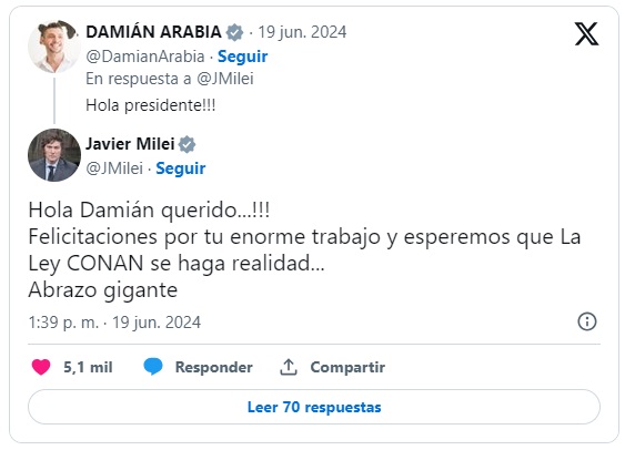 “Hola Damián querido…!!! Felicitaciones por tu enorme trabajo y esperemos que La Ley CONAN se haga realidad… Abrazo gigante”, escribió el jefe de Estado en su cuenta de X (antes Twitter).