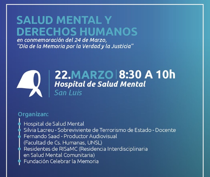 El Hospital de Salud Mental realizará un evento conmemorativo por el Día Nacional de la Memoria por la Verdad y la Justicia, bajo el lema ‘Rompiendo silencios, construyendo voces’. Será el viernes 22 de marzo a partir de las 08:30 en las instalaciones del centro de salud ubicado en Riobamba extremo norte.