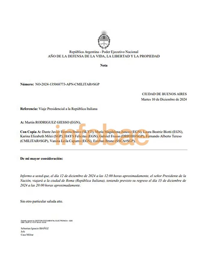 “Informo a usted que, el día 12 de diciembre de 2024 a las 12:00 horas aproximadamente, el señor Presidente de la Nación, viajará a la ciudad de Roma (República Italiana), teniendo previsto su regreso el día 15 de diciembre de 2024 a las 20:00 horas aproximadamente”, se le notificó a la funcionaria de la Cámara alta y estrecha colaboradora de Villarruel.