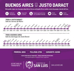 El próximo 22 de julio saldrá desde Retiro el primer servicio para los pasajeros y su frecuencia será semanal. En primera instancia saldrá el día viernes a la noche de Retiro y llegará cerca del mediodía a Justo Daract. Y ese tren vuelve el día domingo, en horas de la tarde y llegará el lunes por la mañana.
