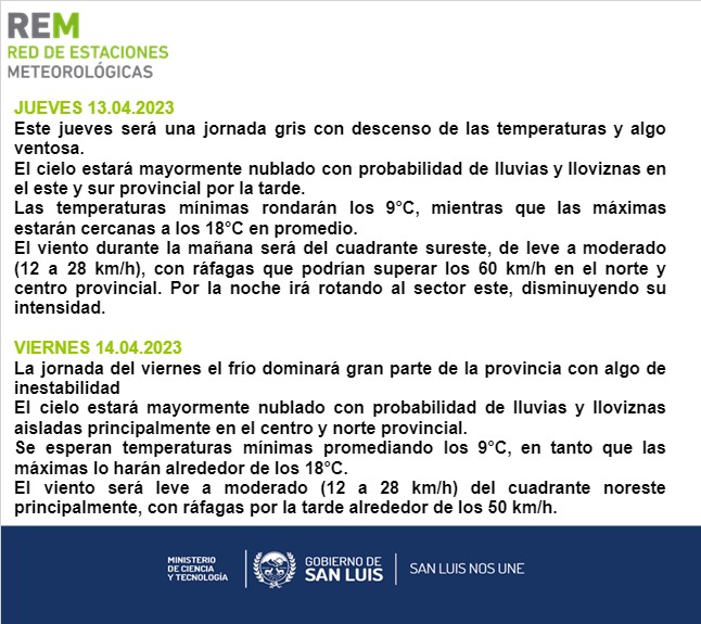 HomeClimaContinua la jornada gris, ventosa y con probabilidades de lluvias Clima Continua la jornada gris, ventosa y con probabilidades de lluvias Por Redacción 13 abril, 2023 TagsPortada Previous articleTodo listo para el PreViaje 4: se anunciará en los próximos díasNext articleFuerte choque de dos autos en la Avenida Santos Ortiz: uno quedó partido al medio Noticias Relacionadas Clima La semana comienza con mañanas frías y chance de heladas en varias localidades 6 octubre, 2025 Clima La semana termina con temperaturas de verano y pronóstico de un fin de semana inestable 3 octubre, 2025 Clima Octubre comienza con abundante nubosidad y temperaturas agradables 1 octubre, 2025 mas leido “San Luis es una de las dos primeras provincias con el índice más alto de donantes” 13 octubre, 2025 Advierten que la Tierra alcanzó el primer “punto de inflexión climático” global por la desaparición de los arrecifes de coral 13 octubre, 2025 Tras las fuertes lluvias, cómo estará el tiempo en el AMBA durante el inicio de la semana 13 octubre, 2025 Un testigo del doble femicidio en Córdoba brindó detalles estremecedores del accionar de Pablo Laurta el día del hecho 13 octubre, 2025 Load more