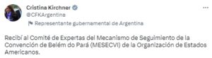 La vicepresidenta Cristina Kirchner recibió este jueves al Comité de Expertas del Mecanismo de Seguimiento de la Convención de Belém do Pará (MESECVI) de la Organización de Estados Americanos (OEA).