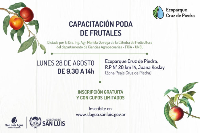 Y agregó: “El próximo 28 de agosto llevaremos a cabo una capacitación en poda de frutales. Es importante destacar que contaremos con la presencia de la doctora e ingeniera agrónoma, Mariela Quiroga, de la Cátedra de Fruticultura del departamento de Ciencias Agropecuarias -FICA, UNSL-. La capacitación es libre y gratuita ingresando a www.slagua.sanluis.gov.ar, completando el formulario ya se encuentran registrados para participar. Cabe aclarar que los cupos son limitados, por lo que recomendamos inscribirse con anticipación”, cerró la funcionaria.