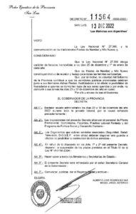 Así lo establece el Decreto N°11564- SS- 2022, firmado por el gobernador, Alberto Rodríguez Saá. La medida fue dispuesta en conmemoración de las tradicionales fiestas de Navidad y Año Nuevo, y contribuir a que los servidores públicos festejen junto a sus familias, facilitando la posibilidad de traslado.