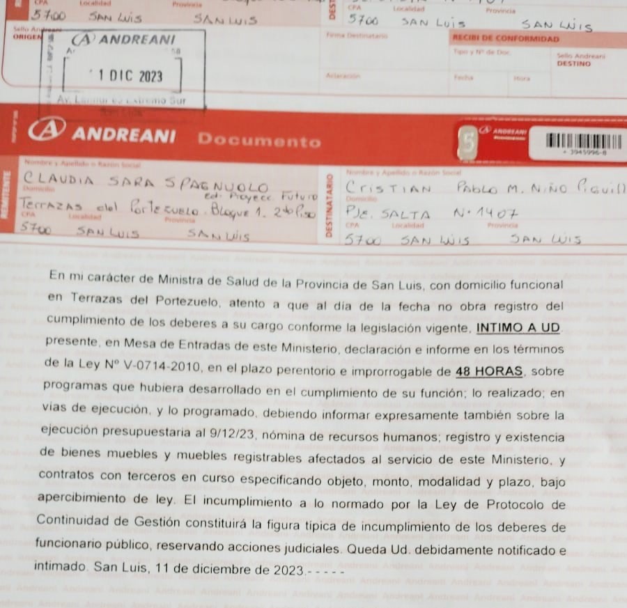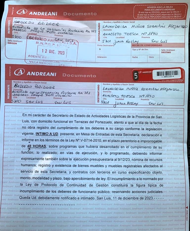 La intimación les llegó a los funcionarios salientes bajo apercibimiento de ley. Según el texto enviado, el incumplimiento de lo normado por la Ley de Protocolo de Continuidad de Gestión constituirá la figura típica de incumplimiento de los deberes de funcionario publico, por lo que las nuevas autoridades se reservan el derecho a iniciar acciones judiciales.