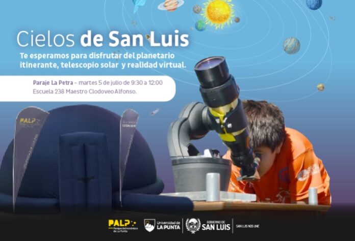La Secretaría de Extensión de la Universidad de La Punta (ULP), a través del Parque Astronómico (PALP) continúa recorriendo el interior de la provincia con “Cielos de San Luis”. En esta oportunidad visitarán este martes desde las 9:30 y hasta las 13:00, la Escuela 238 “Maestro Clodoveo Alfonso”, ubicada en el paraje La Petra.