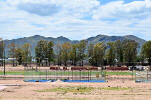 El montaje de las columnas de alumbrado general habla de un considerable progreso en ese aspecto. “En la iluminación del predio -senderos y demás locaciones- también se ve un importante avance. Las luminarias ya están en las canchas de pádel. Vienen incluidas en el montaje en este tipo de estructuras”, detalló.