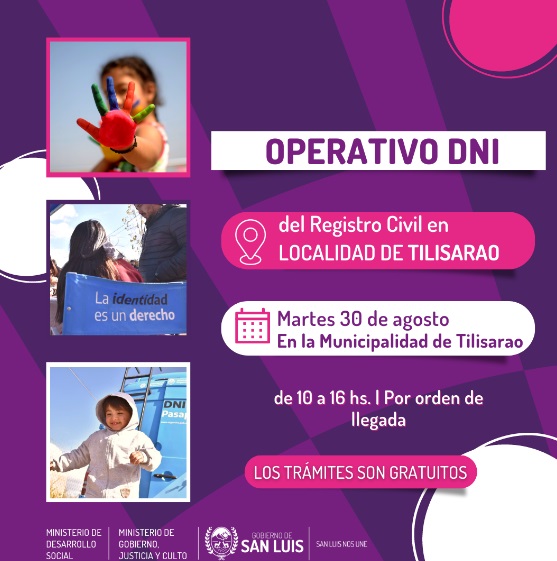 Martes 30 de agosto, el “Operativo DNI” será en la Municipalidad de Tilisarao, de 10:00 a 16:00, por orden de llegada, y se dará en el marco de un trabajo conjunto entre el Gobierno provincial y el municipio local.