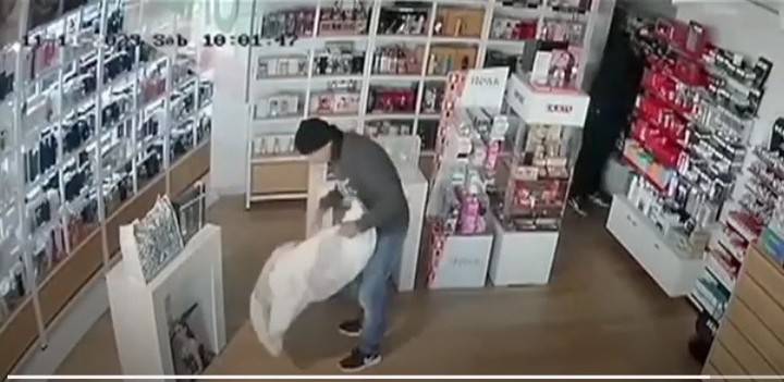 Los ladrones tenían claro su objetivo: iban por mercadería. Perfumes y cremas de marcas caras. Necesitaron menos de 3 minutos para, en trabajo conjunto entre los tres, llenar hasta el tope la gran bolsa blanca.