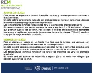 HomeClimaEste jueves tendremos una jornada calurosa, ventosa e inestable Clima Este jueves tendremos una jornada calurosa, ventosa e inestable Por Redacción 22 diciembre, 2022 TagsPortada Previous articleAlberto Fernández apuntó contra la Corte tras el fallo por la coparticipación: “Es un día aciago para el federalismo”Next articleEl nivel de actividad económica registró una suba del 4,5% en octubre Noticias Relacionadas Clima La semana comienza con mañanas frías y chance de heladas en varias localidades 6 octubre, 2025 Clima La semana termina con temperaturas de verano y pronóstico de un fin de semana inestable 3 octubre, 2025 Clima Octubre comienza con abundante nubosidad y temperaturas agradables 1 octubre, 2025 mas leido Un camión volcó en la ruta 147: el conductor resultó ileso 10 octubre, 2025 El Carrillo recibió un certificado de la OPS por su labor en vigilancia de infecciones respiratorias 10 octubre, 2025 San Luis: prisión preventiva para un joven acusado de incendiar una vivienda y amenazar a vecinos 10 octubre, 2025 El ministerio de Salud impulsa acciones en toda la provincia para la prevención del cáncer de mama 10 octubre, 2025 Load more