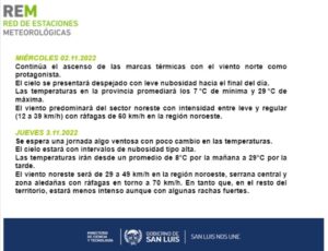 HomeClimaEste miércoles sube la temperatura; se esperan fuertes vientos que superarían los... Clima Este miércoles sube la temperatura; se esperan fuertes vientos que superarían los 60 km/h Por Redacción 2 noviembre, 2022 TagsPortada Previous articleElisa Carrió: “Si en Juntos por el Cambio no hay una lista honesta, iremos con mi candidatura”Next articleAlberto Fernández le tomó juramento a Santiago Maggiotti como ministro de Desarrollo Territorial y Hábitat Noticias Relacionadas Clima La semana comienza con mañanas frías y chance de heladas en varias localidades 6 octubre, 2025 Clima La semana termina con temperaturas de verano y pronóstico de un fin de semana inestable 3 octubre, 2025 Clima Octubre comienza con abundante nubosidad y temperaturas agradables 1 octubre, 2025 mas leido Un camión volcó en la ruta 147: el conductor resultó ileso 10 octubre, 2025 El Carrillo recibió un certificado de la OPS por su labor en vigilancia de infecciones respiratorias 10 octubre, 2025 San Luis: prisión preventiva para un joven acusado de incendiar una vivienda y amenazar a vecinos 10 octubre, 2025 El ministerio de Salud impulsa acciones en toda la provincia para la prevención del cáncer de mama 10 octubre, 2025 Load more