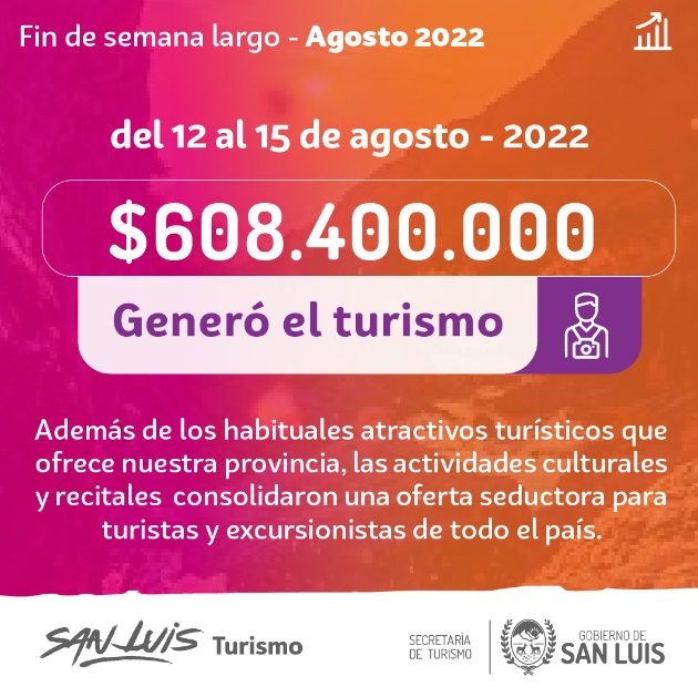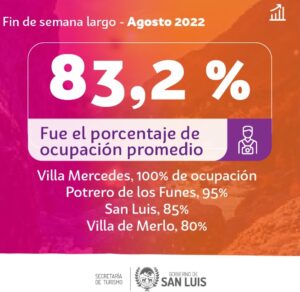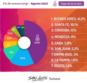 El arribo de turistas de diferentes puntos del país, que eligieron a San Luis este fin de semana extra largo, ubicó una vez más a la provincia entre los destinos más elegidos. Entre el 12 y el 15 de agosto la ocupación alcanzó el 83,2% en promedio, la mayor afluencia de viajeros fue de la provincia de Buenos Aires.