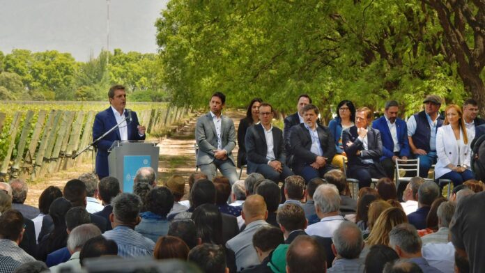 El jefe del Palacio de Hacienda lanzó el plan de protección para economías regionales en un acto que compartió, entre otros, con el gobernador de Mendoza, Rodolfo Suarez; la senadora nacional, Anabel Fernández Sagasti; el secretario de Coordinación Federal y Operativa Agropecuaria, Jorge Solmi; y el presidente del Instituto Nacional de Tecnología Agropecuaria (INTA), Mariano Garmendia.