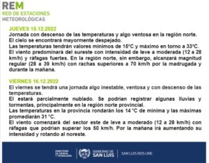 HomeClimaJornada con descenso de temperaturas y algo ventoso Clima Jornada con descenso de temperaturas y algo ventoso Por Redacción 15 diciembre, 2022 TagsPortada Previous articleLos piqueteros cortarán rutas y puentes en rechazo al bono que el Gobierno anunció para beneficiarios del Potenciar TrabajoNext articleLos trabajadores formales cobrarán un bono de fin de año de 24 mil pesos Noticias Relacionadas Clima La semana comienza con mañanas frías y chance de heladas en varias localidades 6 octubre, 2025 Clima La semana termina con temperaturas de verano y pronóstico de un fin de semana inestable 3 octubre, 2025 Clima Octubre comienza con abundante nubosidad y temperaturas agradables 1 octubre, 2025 mas leido Un camión volcó en la ruta 147: el conductor resultó ileso 10 octubre, 2025 El Carrillo recibió un certificado de la OPS por su labor en vigilancia de infecciones respiratorias 10 octubre, 2025 San Luis: prisión preventiva para un joven acusado de incendiar una vivienda y amenazar a vecinos 10 octubre, 2025 El ministerio de Salud impulsa acciones en toda la provincia para la prevención del cáncer de mama 10 octubre, 2025 Load more