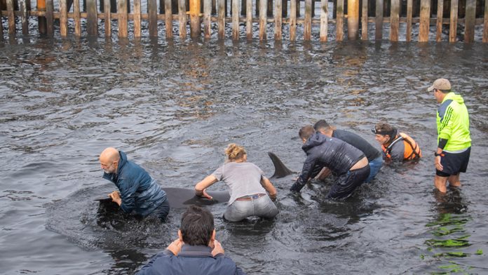 Más de una decena de delfines quedaron varados en la costa de Ushuaia en la tarde de este domingo donde la Prefectura Naval trabajó para liberarlos.