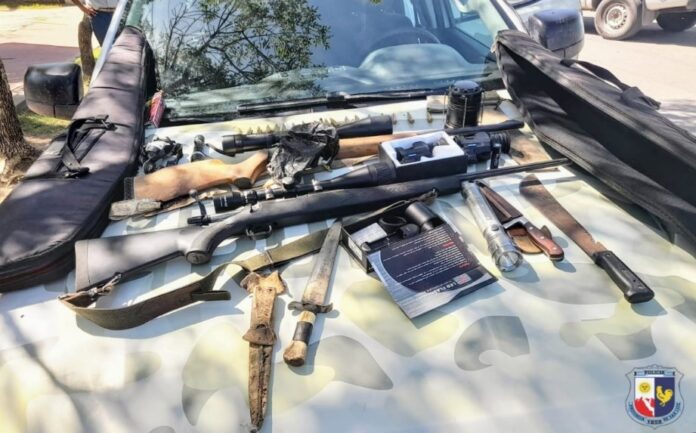 Los sujetos llevaban un fusil Mossberg 308 Winchester con su respectiva funda y un fusil monotiro Rossi 308 Winchester con mira telescópica Bushnell, de los cuales tenían documentación.