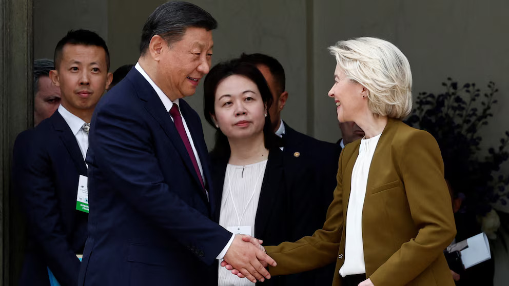 La presidenta de la Comisión Europea Ursula von der Leyen saluda al líder del régimen chino, Xi Jinping (REUTERS/Gonzalo Fuentes/Archivo)