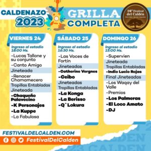 Mientras que el domingo 26, el ingreso al estadio será a partir de las 15:00 con las actuaciones de Supervien, seguida de la presentación de las tropillas entabladas. Luego, se espera la presentación de Indio Lucio Rojas, Los Waqay del Valle, y la gran esperada entrega de premios. Para cerrar el festival, se presentará el grupo santafesino Los Palmeras, El Loco Amato y DJ.
