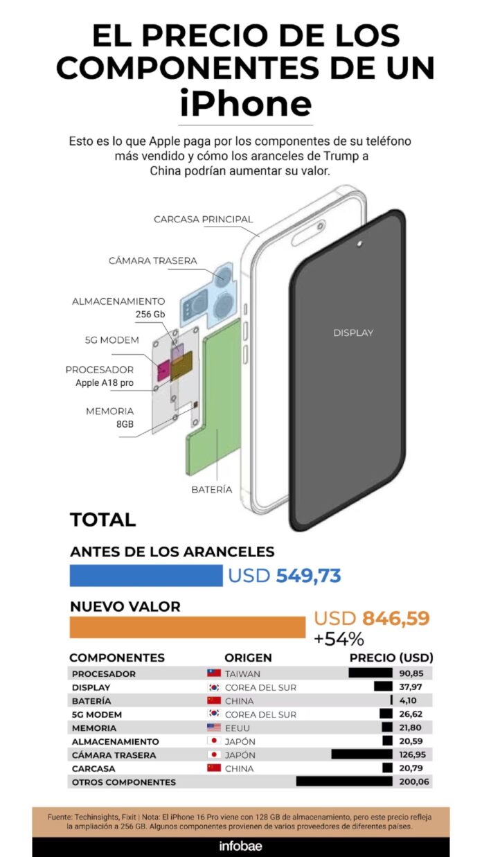 Incluso si Apple decidiera fabricar el iPhone en Estados Unidos, seguiría enfrentando impuestos sobre las numerosas piezas importadas. La fabricación local de cada componente, desde la pantalla táctil hasta el almacenamiento interno, podría elevar el costo del dispositivo a cifras exorbitantes, según publicó TechInsights. Por lo tanto, este complejo panorama sugiere que la producción de un smartphone a un precio competitivo en Estados Unidos es incierta.