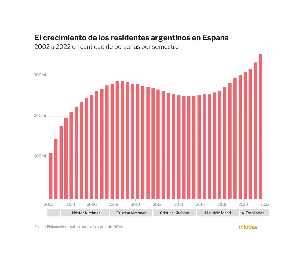 ¿Cuántos argentinos viven en España? Son oficialmente 353.000 los residentes nacidos en Argentina (incluye a los que ingresan con pasaporte europeo), según la última cifra revelada la semana pasada por el INE. Los problemas económicos y la falta de respuestas políticas alimentaron esta tendencia en los últimos cuatro años. Sólo en el período julio 2021-2022, el gobierno local firmó 35.000 nuevas residencias para argentinos. El pasado semestre fue una de las etapas con mayor cantidad de papeles otorgados a argentinos, sólo superado en el año 2002.