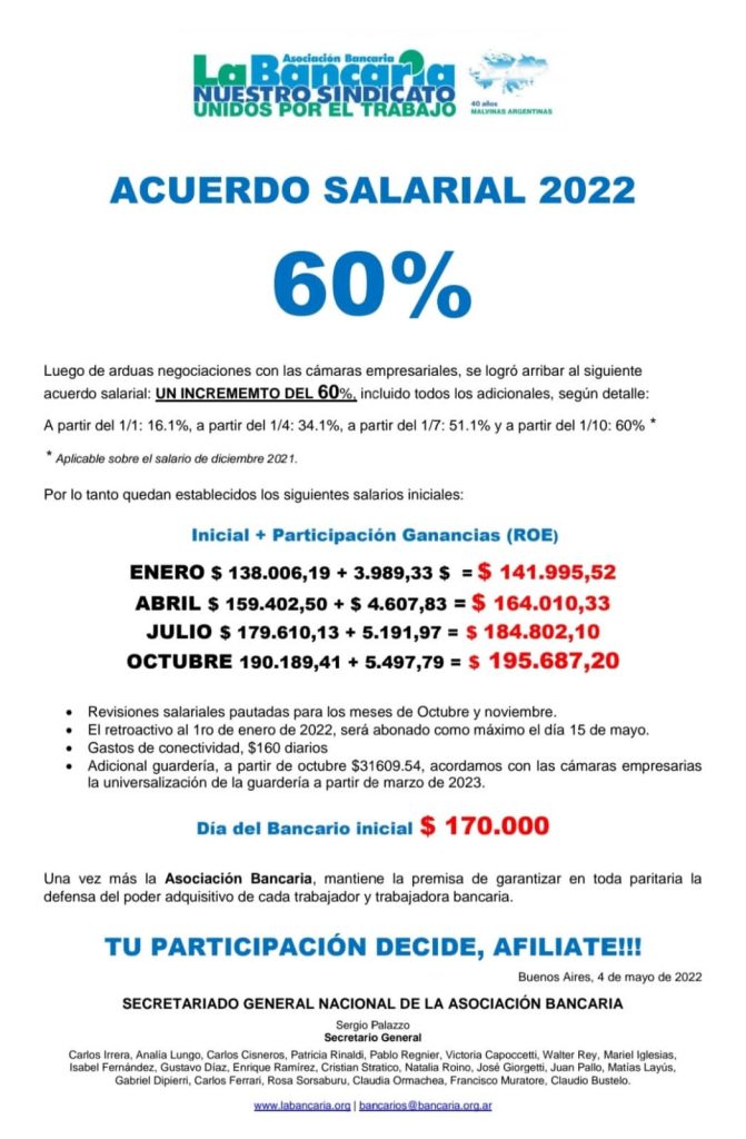 La Asociación Bancaria confirmó este miércoles que logró un acuerdo salarial del 60% a pagarse en cuatro tramos: 16,1% para el tramo de enero a abril 2022; 18% de mayo a junio (34,1%); 17% de julio a septiembre (51,1%) y 8,9% de octubre a diciembre (60%), con revisiones tanto en octubre como en noviembre de este año.