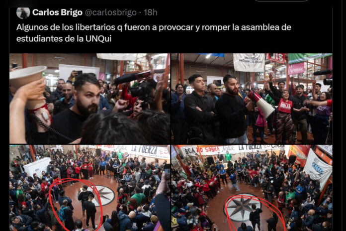 Tras el análisis de las imágenes, las víctimas alcanzaron a identificar a uno de los cabecillas de la fuerza de choque. Se trataría de Julián Rodríguez, militante de la Juventud de LLA de Quilmes y puntero de la concejal Albasetti, quien también se apersonó para romper la asamblea universitaria. “Es ilegal tomar la UNQ. Vamos a atacar”, le había escrito a otras personas según capturas de imágenes que trascendieron en Twitter.