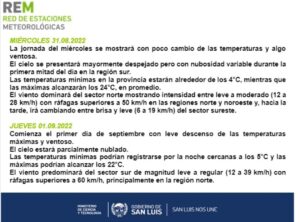 HomeClimaMiércoles mayormente despejado, con nubosidad variable y fuertes ráfagas de viento Clima Miércoles mayormente despejado, con nubosidad variable y fuertes ráfagas de viento Por Redacción 31 agosto, 2022 TagsPortada Previous articleMurió Mikhail Gorbachov, el último líder de la Unión SoviéticaNext articleSu padrastro abusó de ella cuando era niña, lo condenaron a 14 años de cárcel y apeló: “Tengo miedo que lo liberen” Noticias Relacionadas Clima La semana comienza con mañanas frías y chance de heladas en varias localidades 6 octubre, 2025 Clima La semana termina con temperaturas de verano y pronóstico de un fin de semana inestable 3 octubre, 2025 Clima Octubre comienza con abundante nubosidad y temperaturas agradables 1 octubre, 2025 mas leido Un camión volcó en la ruta 147: el conductor resultó ileso 10 octubre, 2025 El Carrillo recibió un certificado de la OPS por su labor en vigilancia de infecciones respiratorias 10 octubre, 2025 San Luis: prisión preventiva para un joven acusado de incendiar una vivienda y amenazar a vecinos 10 octubre, 2025 El ministerio de Salud impulsa acciones en toda la provincia para la prevención del cáncer de mama 10 octubre, 2025 Load more