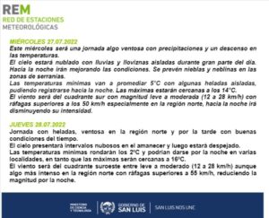 HomeClimaMitad de semana con descenso de temperaturas, lluvias y ventoso Clima Mitad de semana con descenso de temperaturas, lluvias y ventoso Por Redacción 27 julio, 2022 TagsPortada Previous articleEl BCRA creó un nuevo tipo de cambio para que los productores de soja vendan la cosechaNext articleMarcha de antorchas: masivo homenaje a Eva Perón a 70 años de su muerte Noticias Relacionadas Clima Pronostican un miércoles caluroso y a pleno sol 3 diciembre, 2025 Clima Anuncian un martes cálido con probabilidad de tormentas aisladas 2 diciembre, 2025 Clima La lluvia hizo bajar la temperatura, pero la máxima llegaría a 32º este jueves 27 noviembre, 2025 mas leido San Luis: Bomberos de la Policía sofocaron distintos incendios que se registraron durante la mañana de este jueves 4 diciembre, 2025 La Provincia invita a los comerciantes a participar en la elaboración de la Canasta Navideña 2025 4 diciembre, 2025 Un hombre falleció tras ser atropellado por un camión en avenida Santos Ortiz 4 diciembre, 2025 La Nave Cultural anunció la convocatoria de talleristas y celebrará un gran cierre de año 3 diciembre, 2025 Load more