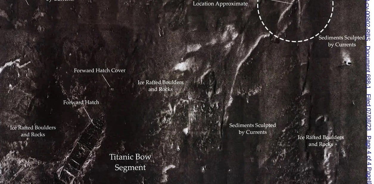 El mapa del lecho marino, adjunto a un archivo legal como exhibición, muestra el contorno fantasmal de la sección de proa del Titanic.