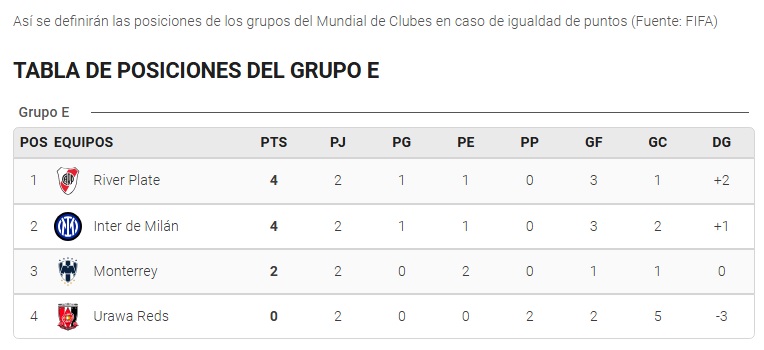 - Si River Plate empata 1-1 con Inter y Monterrey gana 4-2 o más por diferencia de dos, queda eliminado
