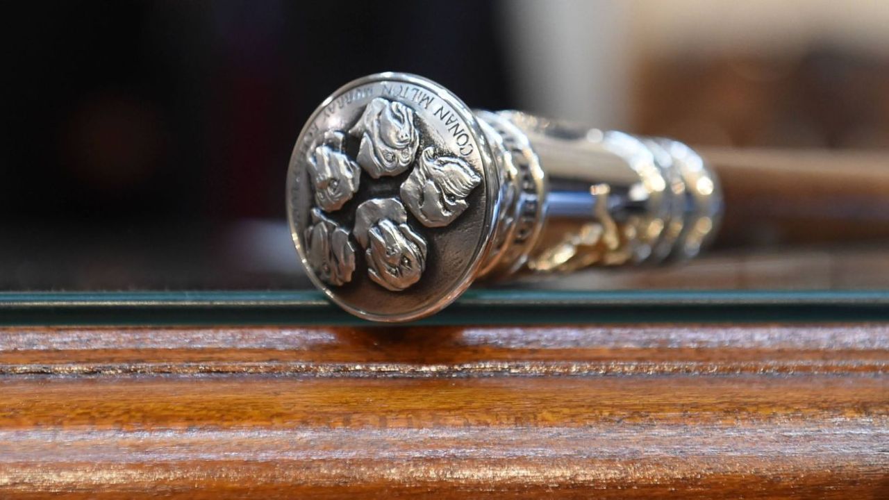 Los cinco mastines, el detalle del bastón presidencial de Javier Milei.Los cinco mastines, el detalle del bastón presidencial de Javier Milei.