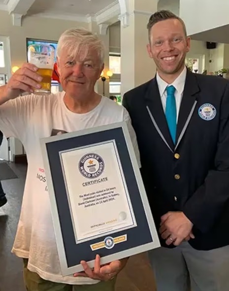 David Clarkson tiene 69 años y es oriundo de Reino Unido, pero se instaló en Australia desde hace más de cuatro décadas. El hombre eligió las calles de Sídney para marcar una historia que se consagró como un Récord Guinness y superó así a los australianos Harry Kooros y Jake Loiterton, que visitaron 99 bares en un día.