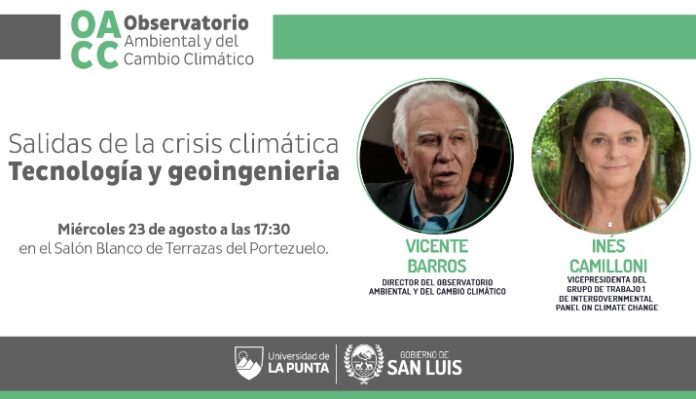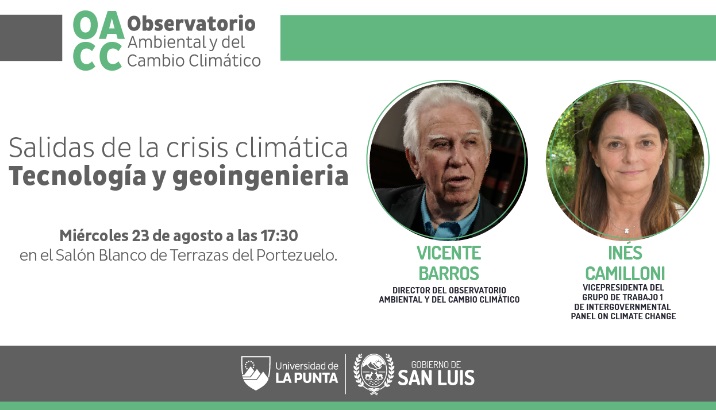 La Universidad de la Punta invita al público en general interesado en el cambio climático a la presentación que dará el director del Observatorio Ambiental y del Cambio Climático, Vicente Barros, junto a la vicepresidenta del Grupo de Trabajo del Intergovernmental Panel on Climate Change (IPCC), Inés Camilloni. La charla será este miércoles 23 de agosto, a las 17:30, en el Salón Blanco de Terrazas del Portezuelo.