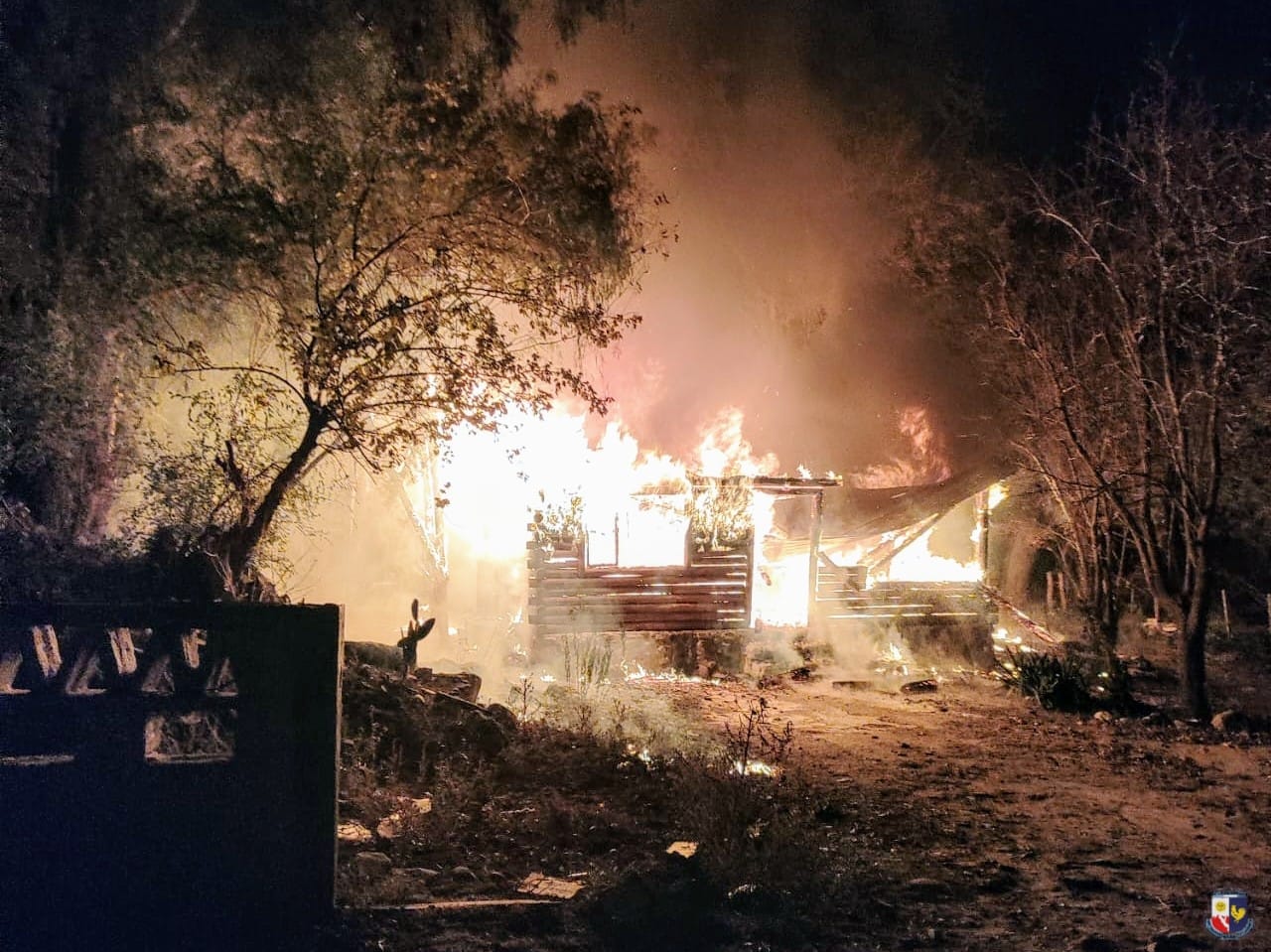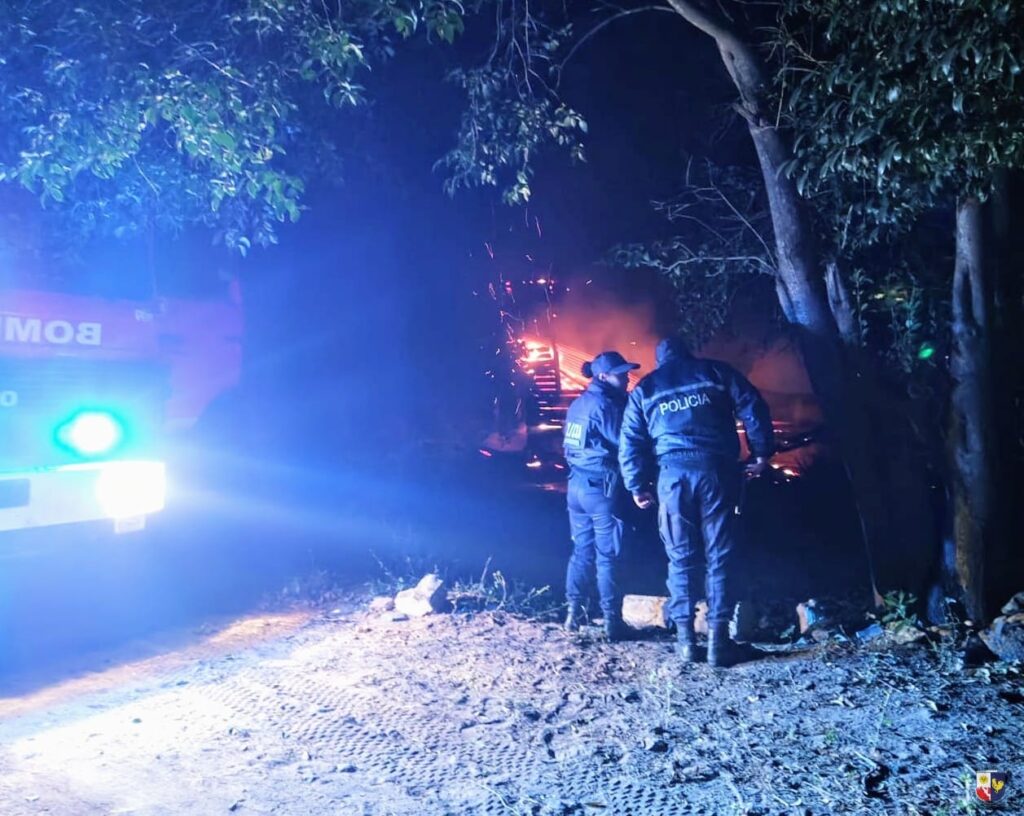 Inmediatamente se le dio aviso a personal de Bomberos Voluntarios de la localidad, quienes junto al personal policial acudieron al lugar y constataron el incendio en la vivienda estilo cabaña de rollizos de madera y techo de chapa.