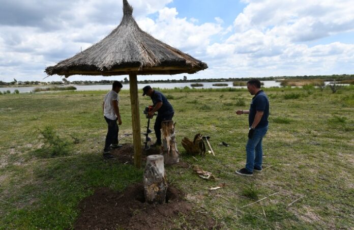 Manteniendo vigente el Plan de Mantenimiento Integral de Peridique, se realizaron trabajos de desmalezamiento y colocaron asientos debajo de las sombrillas. Además, integrantes de la sociedad del Estado dialogaron con la intendenta de la localidad, Carolina Salinas.
