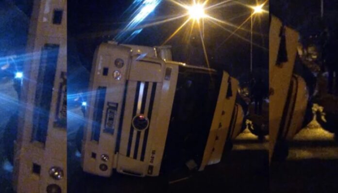 El vehículo Marca Volkswagen Modelo 18310 quedó tendido sobre su costado izquierdo y con su frente orientado al este. Ocupaba media calzada y su carga quedó tendida sobre el cantero central.