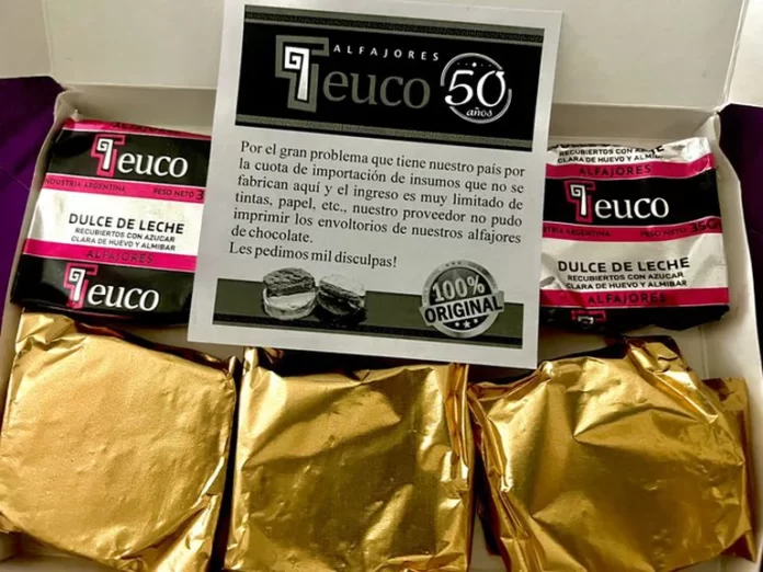 “Por el gran problema que tiene nuestro país por la cuota de importación de insumo que no se fabrican aquí y el ingreso muy limitado de tintas, papel, etc., nuestro proveedor no pudo imprimir los envoltorios de nuestros alfajores de chocolate. ¡Les pedimos disculpas!”, es el mensaje que Alfajores Teuco colocó en sus cajas.
