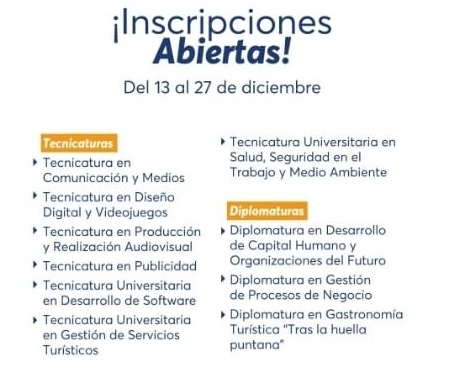 Son 7 tecnicaturas y 3 diplomaturas que la Universidad de La Punta (ULP) pone a disposición para que los interesados amplíen su currícula académica en territorio puntano. Ingresando a www.ulp.edu.ar podrán anotarse desde este miércoles hasta el 27 de diciembre.