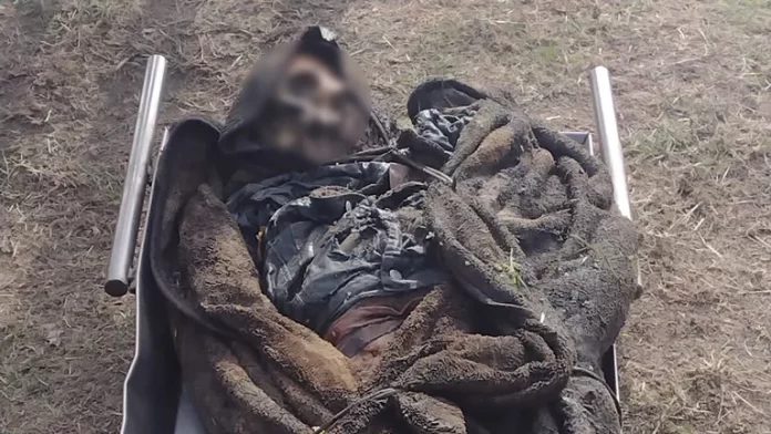 Un cadáver esquelético, envuelto en una frazada y con un tiro en la cabeza