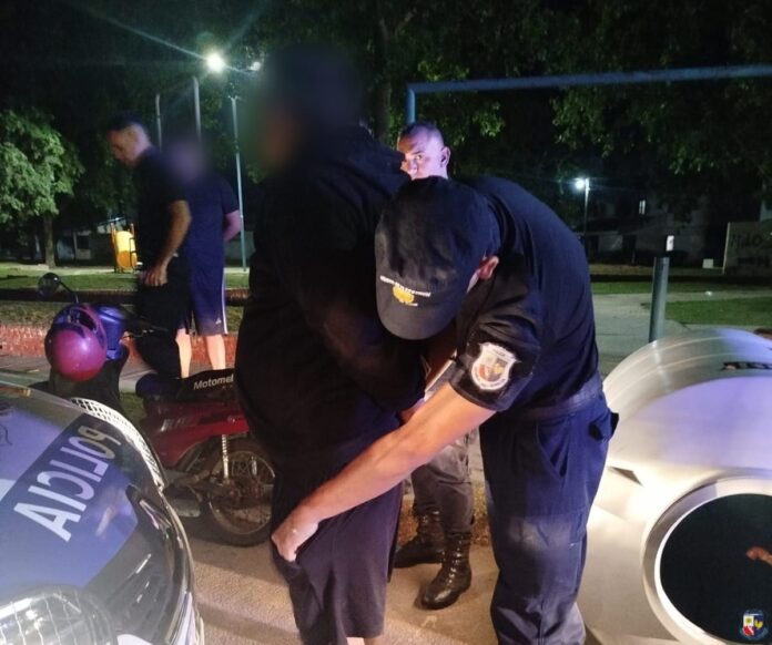 Los efectivos acudieron al lugar, pero no lograron dar con los delincuentes. Inmediatamente se realizó un recorrido por la zona y en inmediaciones de las calles Maipú y Europa visualizaron a los sujetos en motocicleta y trasladando el tanque de agua sustraído. Al darles la voz de alto por el megáfono, los individuos arrojaron el tanque e intentaron darse a la fuga, pero fueron interceptados y demorados a los pocos metros.