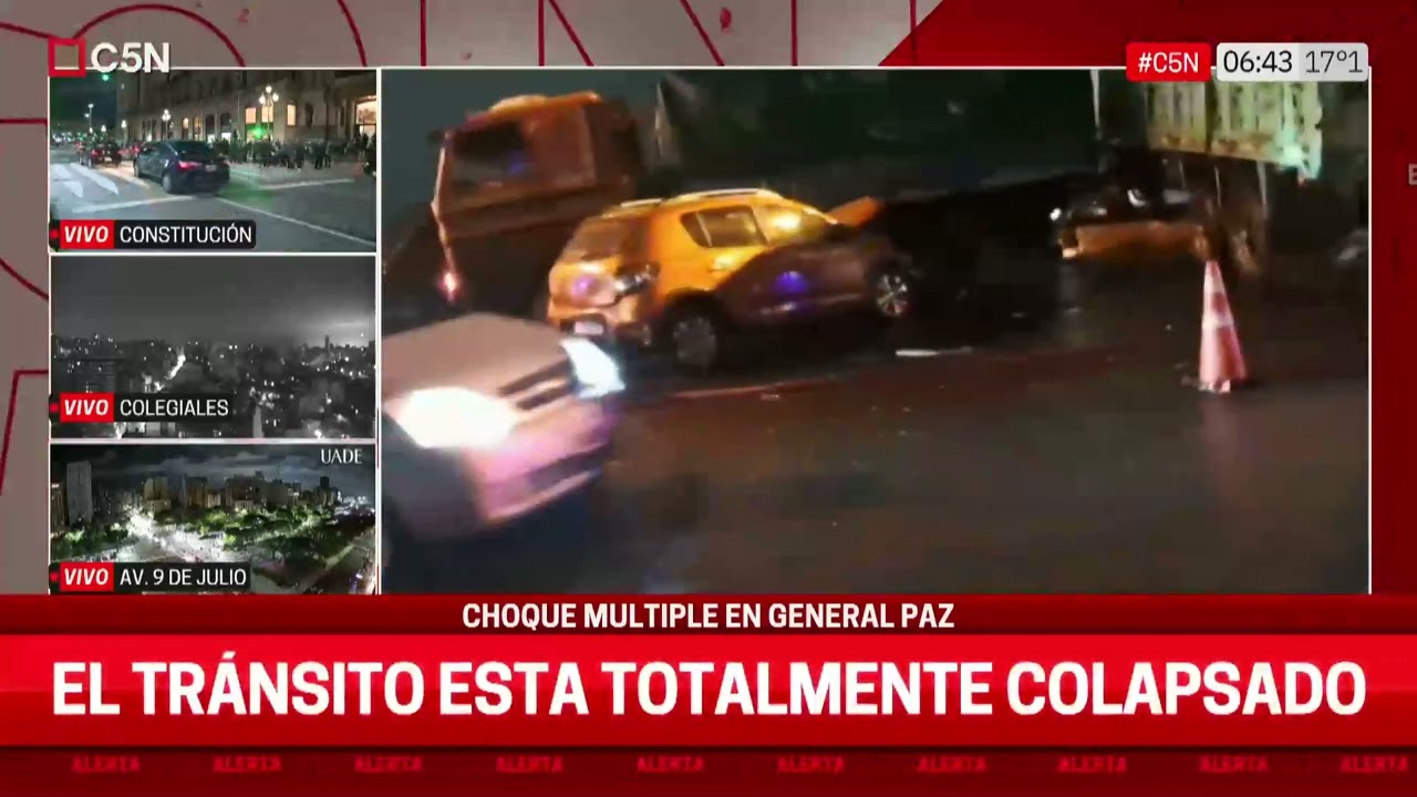 Un camión con acoplado y dos autos protagonizaron un violento choque este lunes a la madrugada sobre la avenida General Paz, la cual se encuentra con la circulación reducida a la altura de José Barros Pazos (Villa Riachuelo). Producto del siniestro, una persona debió ser hospitalizada con politraumatismos, mientras que operarios de Autopistas del Sol y Bomberos de la Ciudad trabajaban en el lugar para ordenar el tránsito y remover los rodados involucrados en el accidente vial.